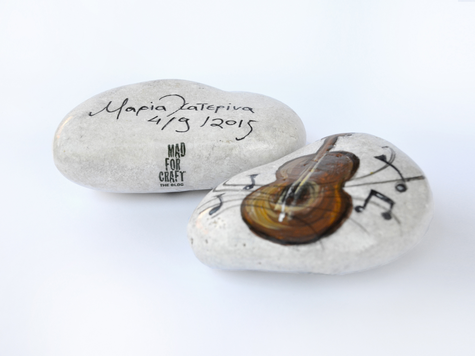 Ξεκίνησα το σχεδιασμό και καταλήξαμε σε 7 διαφορετικά σχέδια, πιάνο, σαξόφωνο, τυμπανάκι, κλαρινέτο, τούμπα, βιολί και κιθάρα. Μου ζητήθηκε επίσης στο πίσω μέρος κάθε πέτρας να γράψω το όνομα του μικρού κοριτσιού και την ημερομηνία της βάφτισης.